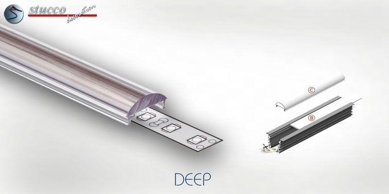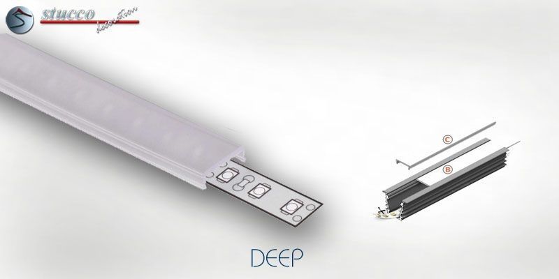 Die Aluminiumleiste DEEP eignet sich hervorragend, um Übergänge zu betonen oder Bereiche optisch voneinander zu trennen. So können z.B. Türöffnungen und Durchgänge damit umrahmt, der Küchenbereich vom Wohn- oder Esszimmer getrennt werden. Um die Wirkung zu verstärken kann diese Aluleiste auch in Stuckleisten aus Styropor eingelassen oder mit Styropor Zierleisten ergänzt werden. Dadurch spendet die indirekte Beleuchtung nicht nur angenehmes Licht, sondern wird sogar zum vielbewunderten Blickfang. Alle LED Strips und RGB Stripes aus unserem Sortiment sind für den Einbau in diese Leiste geeignet.