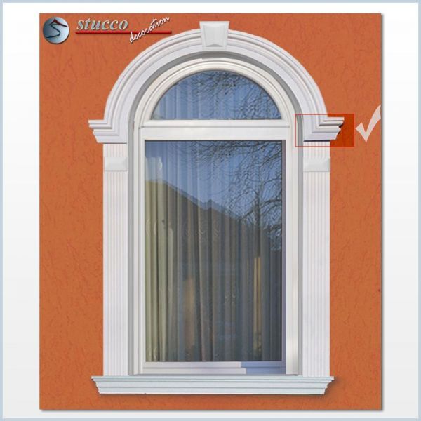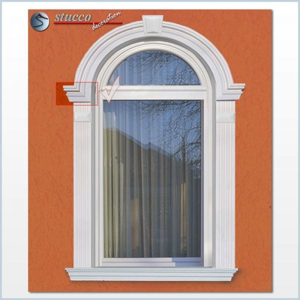 Dreiseitige Fensterumrahmung: Beschichtete Fassadenstuck Stuckleisten Bangkok 103 für den Fenstersturz und die Fensterseiten. Die in Größe und Stuckmuster passenden 90-Grad-Eckelemente erleichtern die Ausführung der Stuckarbeiten.