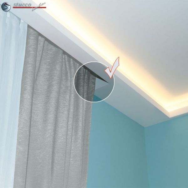 Die Stuckleiste Innsbruck 214 für indirekte Wandbeleuchtung ist eine praktische und dekorative Wandleiste. In die innere Aussparung der Zierleiste können neben den LED Reflektorstreifen aus Aluminium und den LED Strips auch die Plexistreifen als Staubschutz für die LED Strips eingebaut werden.
