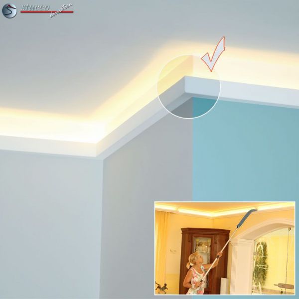 Die Stuckleiste Innsbruck 214 Plexi Plus für indirekte Wandbeleuchtung ist eine praktische und dekorative Wandleiste. In die innere Aussparung der Zierleiste können neben den LED Reflektorstreifen aus Aluminium und den LED Strips auch die Plexistreifen als Staubschutz für die LED Strips eingebaut werden.
