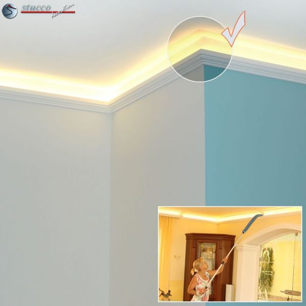 Die Stuckleiste Berlin 201 Plexi Plus für indirekte Wandbeleuchtung ist eine praktische und dekorative Wandleiste. In die innere Aussparung der Zierleiste können neben den LED Reflektorstreifen aus Aluminium und den LED Strips auch die Plexistreifen als Staubschutz für die LED Strips eingebaut werden.