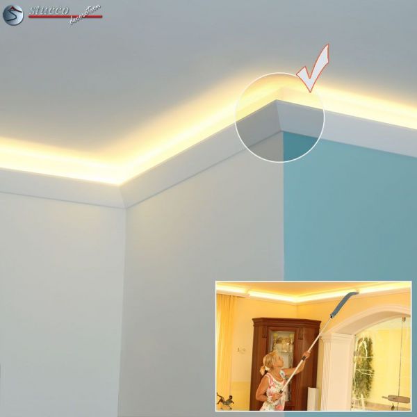 Durch den Einbau der LED Reflektorleisten optimieren Sie Ihre indirekte Beleuchtung, denn die Lichtstärke der LED Streifen wird verdoppelt, die LEDs werden gekühlt und das Durchscheinen des Lichts durch die Styroporleiste wird verhindert.