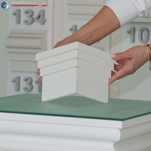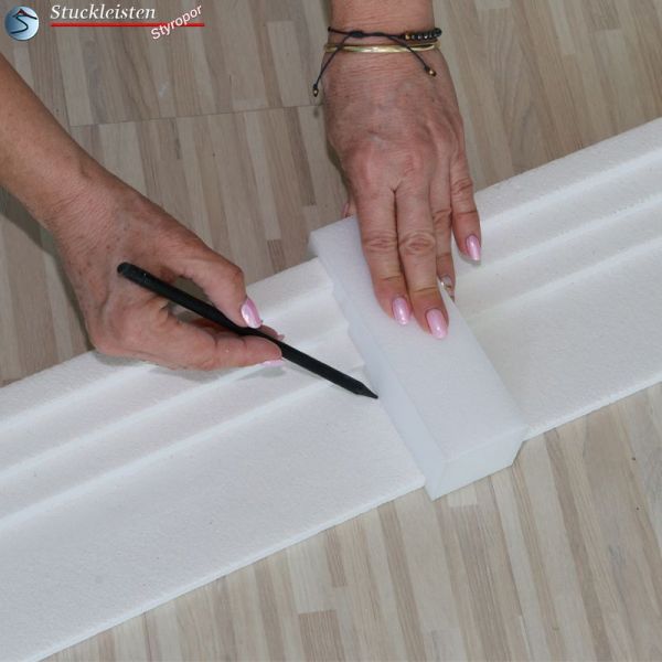 Schneiden Sie die Außenstuck Zierleiste so auf Maß, dass nach dem Ankleben der Leistenstücke zwischen den Eckelementen/Schließelementen und der Profilleiste 5-8 mm breite Stoßfugen entstehen.