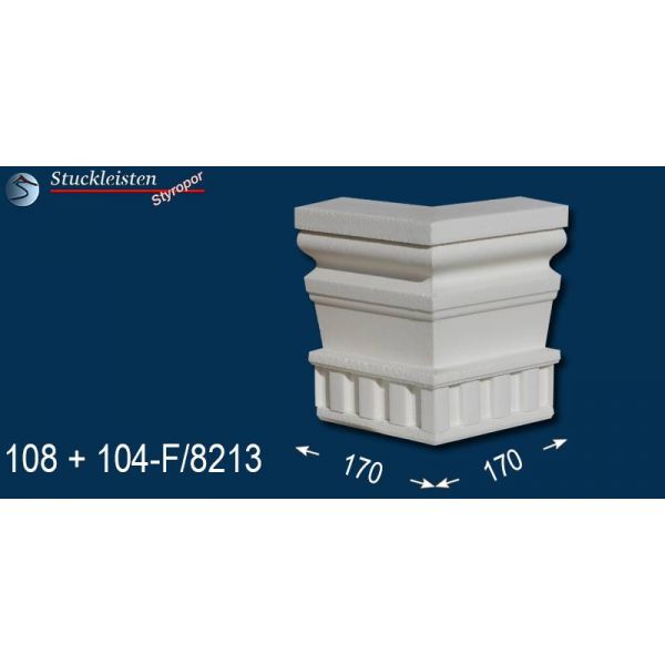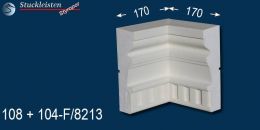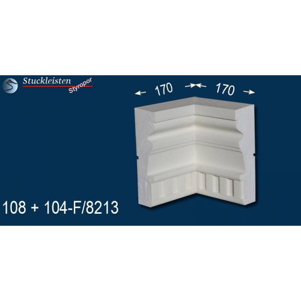 Sowohl auf dieser bemaßten Querschnittszeichnung als auch auf den nachfolgenden Produktbildern mit dem blauen Hintergrund finden Sie die Maße des beschichteten Fassadenprofils Mainz 108+104F/8213 und seiner Ergänzungselemente. Prüfen Sie bitte vor dem Bestellen, ob genügend Platz zum Anbringen der Stuckelemente zur Verfügung steht. Diese Fassadenstuckleiste lässt sich aufgrund des zeitlosen, schlichten Musters sehr gut mit anderen Fassadenelementen und Stuckmustern kombinieren. Kontrollieren Sie anhand der Maße auch, ob die verschiedenen, ausgewählten Zierleisten in der Stärke/Tiefe zueinander passen, damit die Übergänge von Stuckmuster zu Stuckmuster stimmen.