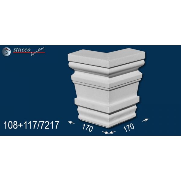 Sowohl auf dieser bemaßten Querschnittszeichnung als auch auf den nachfolgenden Produktbildern mit dem blauen Hintergrund finden Sie die Maße des beschichteten Fassadenprofils Dortmund 108+117/7217 und seiner Ergänzungselemente. Prüfen Sie bitte vor dem Bestellen, ob genügend Platz zum Anbringen der Stuckelemente zur Verfügung steht. Diese Fassadenstuckleiste lässt sich aufgrund des zeitlosen, schlichten Musters sehr gut mit anderen Fassadenelementen und Stuckmustern kombinieren. Kontrollieren Sie anhand der Maße auch, ob die verschiedenen, ausgewählten Zierleisten in der Stärke/Tiefe zueinander passen, damit die Übergänge von Stuckmuster zu Stuckmuster stimmen.