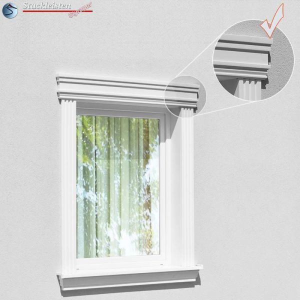 39. Dekorative Fensterumrandung mit der beschichteten Außenstuck Zierleiste Freetown 100 und Dreieckbekrönung 103/117