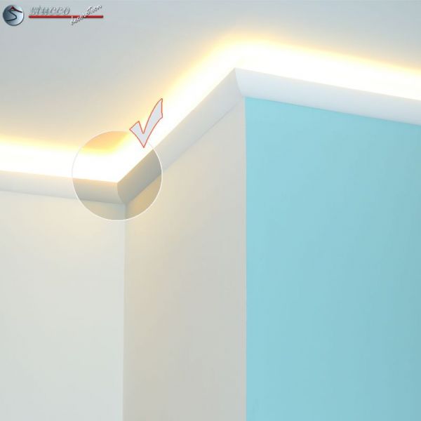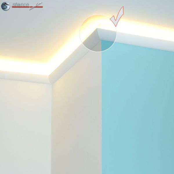 Die Stuckleiste München 204 für indirekte Wandbeleuchtung ist eine praktische und dekorative Wandleiste. In die innere Aussparung der Zierleiste können neben den LED Reflektorstreifen aus Aluminium, den Plexistreifen zum Staubschutz auch die LED Strips eingebaut werden.