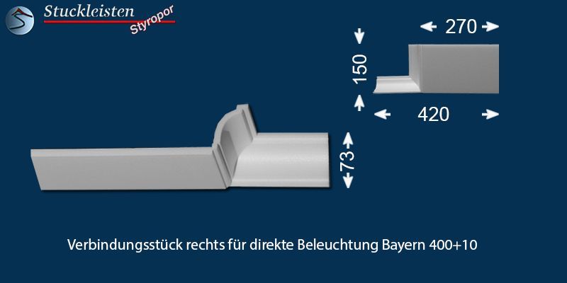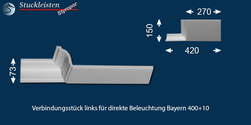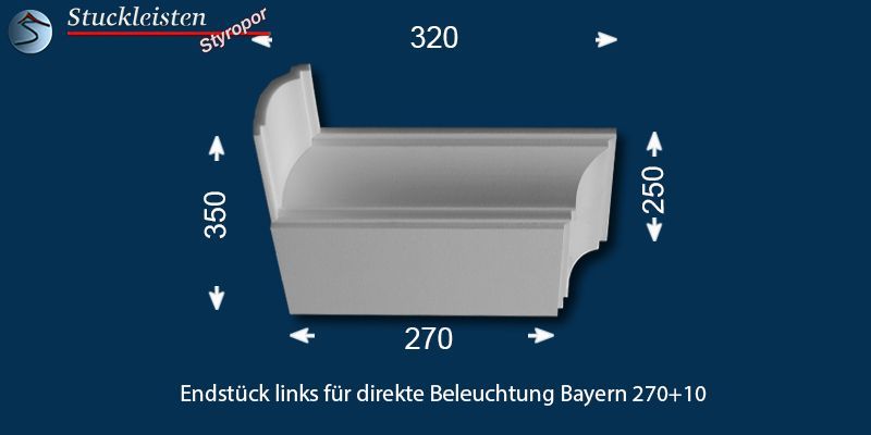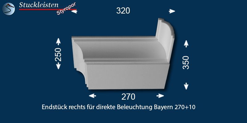 Das Stuckprofil Bayern 270+10 ist eine Stuckleiste aus Polystyrol Hartschaum (XPS), welche speziell für den Einbau von LED Spots entwickelt wurde. Die Gesamtbreite des Profils beträgt 320 mm, für den Einbau der LED Spots bietet die Grundplatte eine Breite von 270 mm. Das Stuckprofil ist 73 mm hoch und kann nahtlos mit der klasssichen Stuckleiste Bayern 10 verbunden werden.