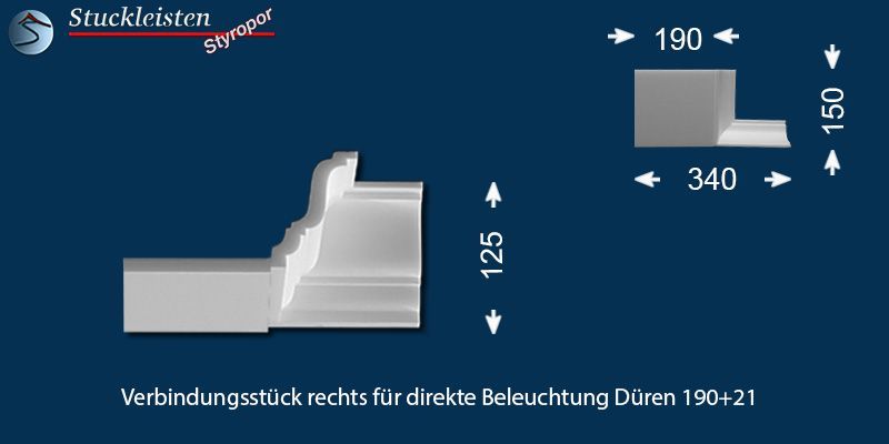 Rechtes und linkes Verbindungsstück: Falls eine Wandseite im Raum mit der klassischen Deckenleiste Düren 21 und die anschließende Wandseite mit dem Stuckprofil für direkte Beleuchtung Düren 190+21 verziert wird, dann sind die Verbindungsstücke ideal, um die beiden Stuckleisten in den Zimmerecken miteinander zu verbinden. An den einen Schenkel des Verbindungsstücks lässt sich die Zierleiste Düren 21 anfügen, an den anderen Schenkel das Stuckprofil Düren 190+21.