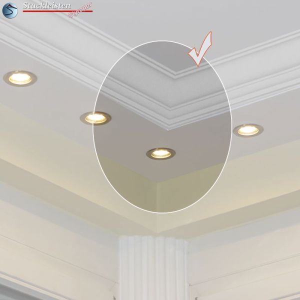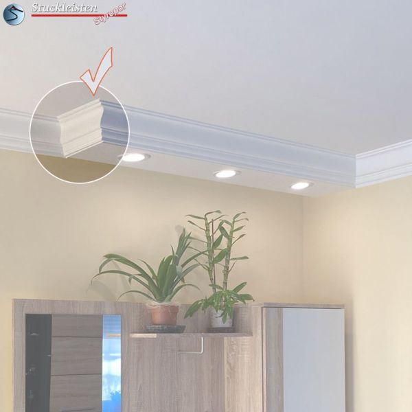 Bei der Innenraumgestaltung werden meistens alle Wände eines Raumes mit der gleichen Stuckleiste verziert. Die Stuckleiste wird in die Hohlkehle zwischen Wand und Decke geklebt, hat also zwei Klebeflächen: eine an der Wand, die andere an der Decke. Doch wie soll man verfahren, wenn man eine Gardinenstange mit der Stuckleiste verkleiden möchte? Bei den Fenstern steht meist nur die Klebefläche an der Decke zur Verfügung. Aus diesem Grund bieten wir passend zur Stuckleiste Düren 21 die Vorhangleiste Düren 21 an. Die Vorhangleiste zur Stuckleiste Düren 21 verfügt über eine breitere obere Klebefläche. So kann die Profilleiste trotz nur einer zur Verfügung stehenden Klebefläche stabil fixiert werden. Natürlich sind Innen- und Außenecken auch zur Vorhangleiste als vorgefertigte Stuckelemente erhältlich.