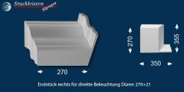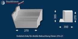Rechtes und linkes Endstück: Die Endstücke ermöglichen auch den Übergang von der Deckenleiste Düren 21 zum Stuckprofil Düren 270+21 – allerdings nicht in der Zimmerecke, sondern an einer beliebigen Stelle entlang der Wand. Mit den Endstücken können Sie das L-förmige Stuckprofil für direkte Beleuchtung Düren 270+21 schön abschließen und die Stuckverzierung mit der Deckenleiste Düren 21 weiterführen.