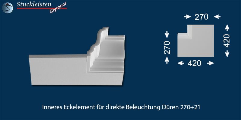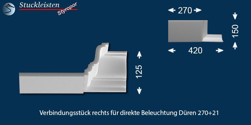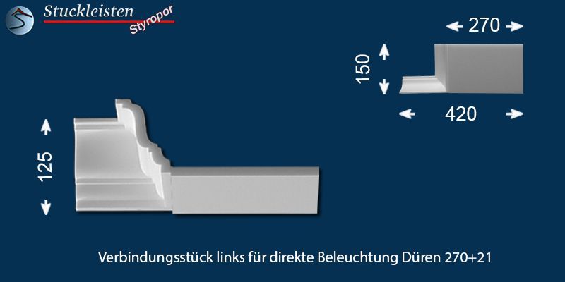 Das Stuckprofil Düren 270+21 ist eine Stuckleiste aus Polystyrol Hartschaum (XPS), welche speziell für den Einbau von LED Spots entwickelt wurde. Die Gesamtbreite des Profils beträgt 355 mm, für den Einbau der LED Spots bietet die Grundplatte eine Breite von 270 mm. Das Stuckprofil ist 125 mm hoch und kann nahtlos mit der klassischen Stuckleiste Düren 21 verbunden werden.