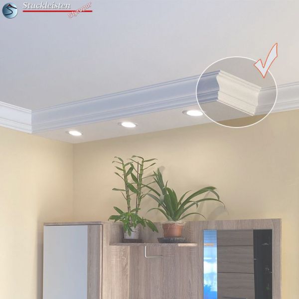 Bei der Innenraumgestaltung werden meistens alle Wände eines Raumes mit der gleichen Stuckleiste verziert. Die Stuckleiste wird in die Hohlkehle zwischen Wand und Decke geklebt, hat also zwei Klebeflächen: eine an der Wand, die andere an der Decke. Doch wie soll man verfahren, wenn man eine Gardinenstange mit der Stuckleiste verkleiden möchte? Bei den Fenstern steht meist nur die Klebefläche an der Decke zur Verfügung. Aus diesem Grund bieten wir passend zur Stuckleiste Düren 21 die Vorhangleiste Düren 21 an. Die Vorhangleiste zur Stuckleiste Düren 21 verfügt über eine breitere obere Klebefläche. So kann die Profilleiste trotz nur einer zur Verfügung stehenden Klebefläche stabil fixiert werden. Natürlich sind Innen- und Außenecken auch zur Vorhangleiste als vorgefertigte Stuckelemente erhältlich.