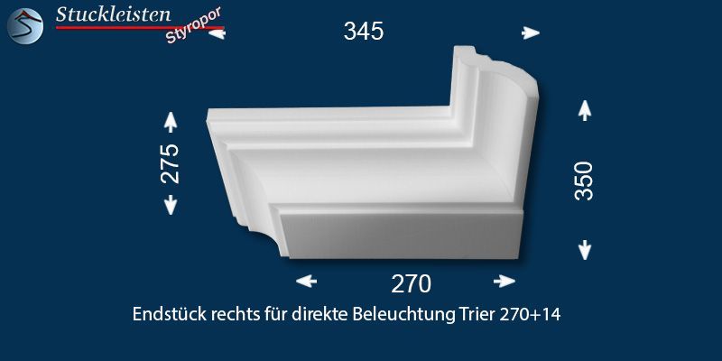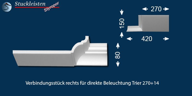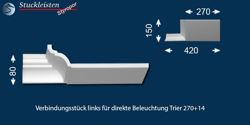 Das Stuckprofil Trier 270+14 ist eine Stuckleiste aus Polystyrol Hartschaum (XPS), welche speziell für den Einbau von LED Spots entwickelt wurde. Die Gesamtbreite des Profils beträgt 345 mm, für den Einbau der LED Spots bietet die Grundplatte eine Breite von 270 mm. Das Stuckprofil ist 80 mm hoch und kann nahtlos mit der klassischen Stuckleiste Trier 14 verbunden werden.