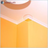 Zum Abschluß müssen die Fugen zwischen der Stuckleiste und der Decke sowie die Fugen zwischen der Wand und der Stuckleiste geschlossen werden. Dies geht einfach, indem etwas Kleber mit Hilfe der Kartuschenpresse auf die Fugen aufgebracht wird. Der Kleber lässt sich mit einem nassen Schwamm oder der angefeuchteten Fingerspitze glätten und verteilen. Wenn alle Stuckarbeiten abgeschlossen sind, brauchen Sie den Styroporstuck nur noch mit einer umweltfreundlichen Farbe auf Wasserbasis (sogenannter Dispersionsfarbe) zu streichen. Dadurch erhalten die Zierleisten und die Stöße ein einheitliches Aussehen und Ihr Stuck aus Styropor wirkt wie aus einem Guss.