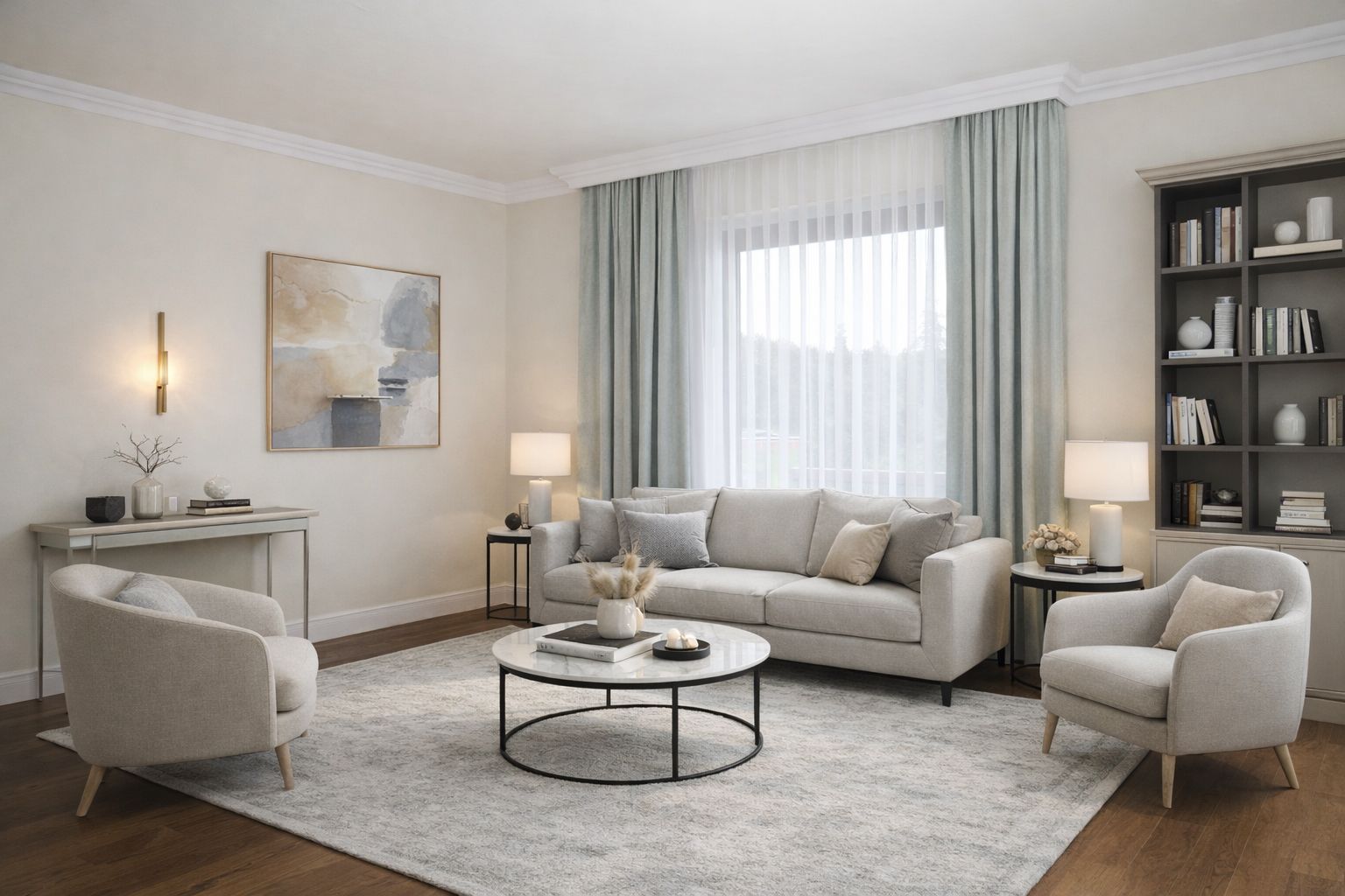 So kann in allen Räumen der Wohnung dasselbe Stuckmuster verwendet werden, was ein harmonisches Gesamtbild und visuelle Einheit schafft, während sich die Proportionen optimal an die jeweilige Raumgröße anpassen.
