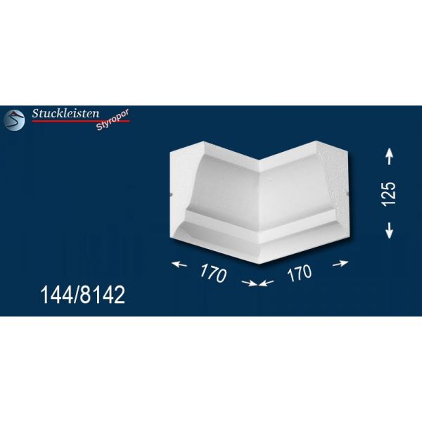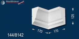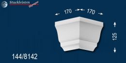 Weitere Ergänzungselemente sind die unterschiedlichen Eckelemente. Mit dem äußeren Eckelement lässt sich die Fassadenstuck Zierleiste Flensburg 144 als Umlaufgesims verwenden. Diese 90-Grad-Ecken brauchen Sie nur an den Hausecken anzukleben, dann die entsprechend langen Zierleisten dazwischen zu kleben und schon können Sie Ihren Erfolg bewundern. Wenn Sie die Gesimsprofile um einen Erker, Balkon oder Hausanbau herumführen möchten, brauchen Sie auch das innere Eckelement, das das Stuckmuster von der Hauswand zum Anbau hinführt.